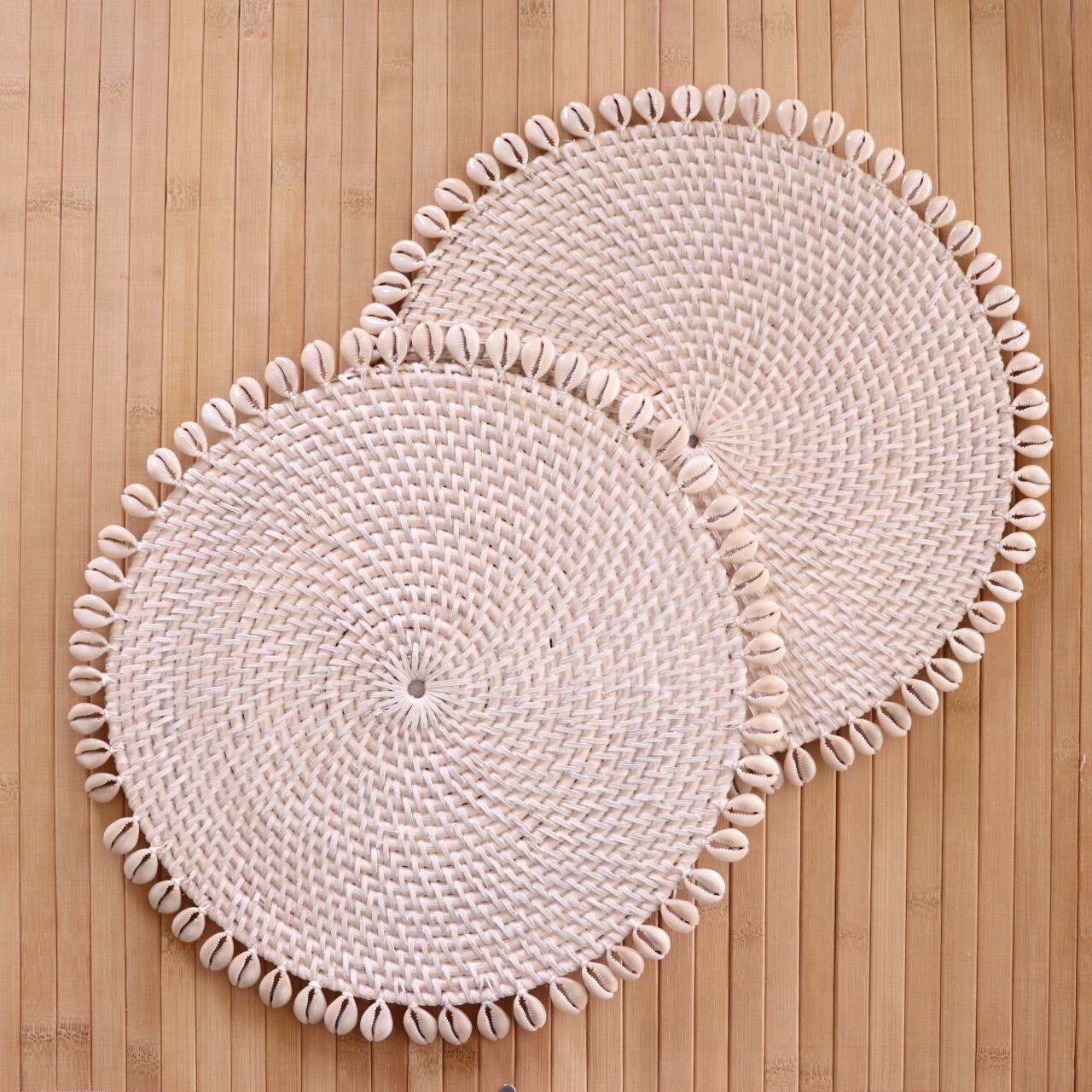 シェルが贅沢に一周ついた籐のプレイスマットです。食事の際のランチョンマットや雑貨を置いてインテリアにしたり、おしゃれな存在感が抜群!リゾートテイストが好きな方にはマストハブです!!